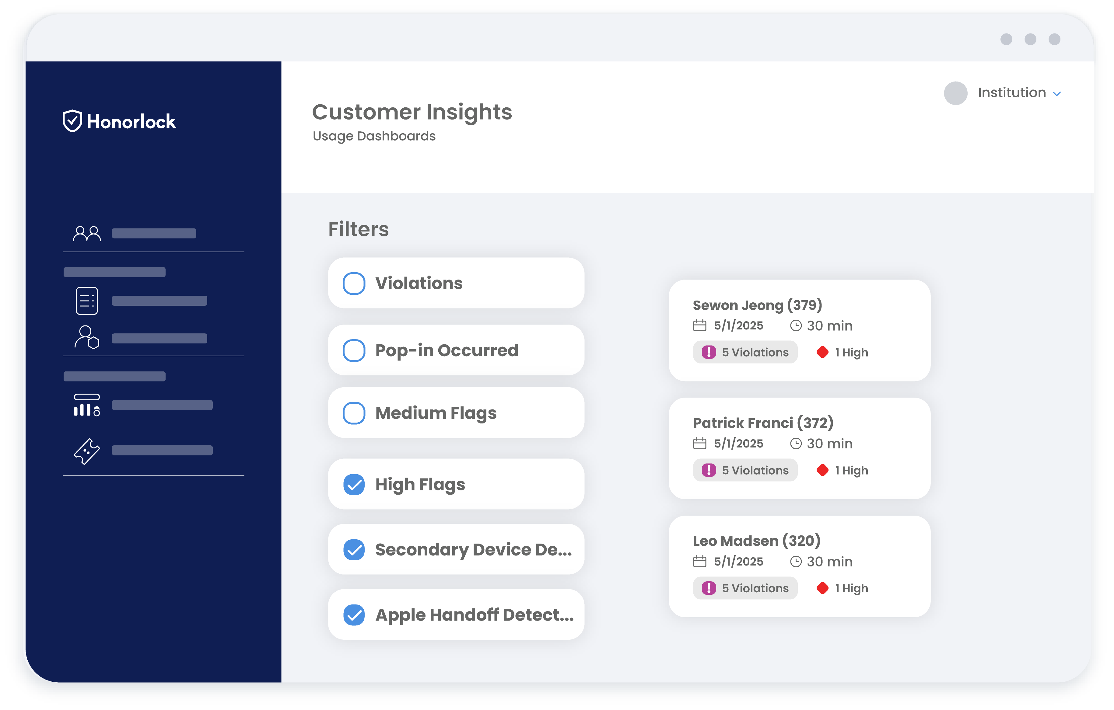 “Students are becoming very savvy and we felt we needed some extra reinforcements. Honorlock gave us those reinforcements through integrity features such as multi-device detection… Honorlock is so easy to access, and the flagging system is perfect.”
